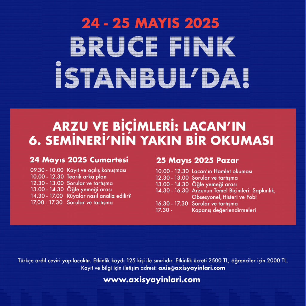 24-25 Mayıs 2025 tarihlerinde İstanbul’da SALT Galata’da gerçekleştirilecek olan Bruce Fink İstanbul’da!: Arzu ve Biçimleri: Lacan’ın 6. Semineri’nin Yakın Bir Okuması adlı etkinliğimize göstermiş olduğunuz ilgiden dolayı teşekkür ederiz. Aşağıda etkinliğin programına ve diğer gerekli bilgilere ulaşabilirsiniz.