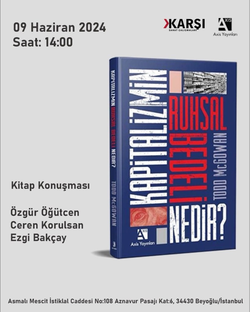 Neden insanlar kapitalizmin alternatifsiz olduğuna inanıyorlar? Kapitalizm çoğumuza sanki bir doğa olayıymış gibi geliyor, aynı gezegenlerin, ayın, güneşin var olduğu gibi. Oysa mesele bu kadar basit değil. Kapitalizm tarihsel olarak şunun şurasında 300-400 yıldır var ve yerini aldığı feodalizmden çok daha fazla zarar verdi. Bir taraftan doğayı yok olmanın eşiğine getirdi, diğer taraftan insanlar arasında devasa eşitsizlikler yarattı. Ama biz ona “inanmaya” devam ediyoruz. İşte tam da bu noktada, kapitalizmin arzumuzla, bilinçdışımızla ve umutlarımızla ilişkisini sorgulamak iyi olabilir. Bizi kendimize bile inanmaktan alıkoyan, bu vaat bombardımanı neyin nesi? Bitmez tükenmez savaşlar, doğanın ve insanların sömürülmesi, umutsuzluk, yalnızlık, depresyon… Kaderimiz çoktan çizilmiş ve kapanmış durumda mı? İşte bu etkinlikte, Todd McGowan’ın kitabından hareketle bütün bunları konuşacağız.